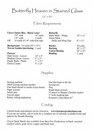 Butterfly Heaven - Quilt As You Go Stained Glass. This is a streamlined stained glass technique using fusible web and fusible bias tape. Within each pattern you will find: Clear step-by-step instructions using many photographs and graphics to illustrate the instructions. Full size pattern - no need to enlarge the design before you begin your project. Tested yardage requirements. Complete binding instructions. Finished size 33" x 22"
