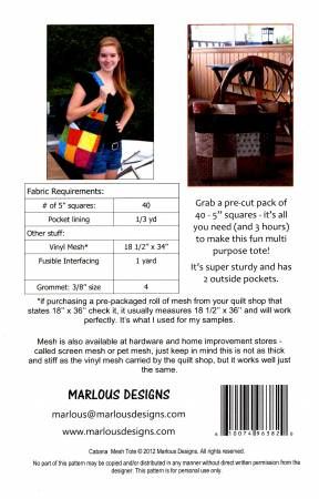 From Marlous Designs By Carter, Marlous In Bags, Purses, Totes & Electronic Covers 17in W x 16in H x 4in D. Suggested viny mesh to order VM+ color number for 36in x 5 yard cuts or VMC- + color number for 18in x 36in cuts from Lyle Enterprises.