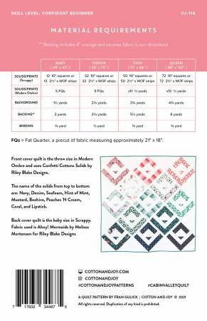 From Cotton and Joy By Gulick, Fran In Quilts Cabin Valley quilt pattern is a fun and modern take on the classic Log Cabin quilt block. The pattern includes two design layouts: Modern Ombre and Scrappy which is precut friendly! This pattern is perfect for beginners ready to tackle on point setting. Sizes: Baby (43in x 43in), Throw (58in x 73in), Twin (73in x 88in), and Queen (88in x 103in). Printed Paper Pattern Final Product: Quilt Finished Size: Throw (58in x 73in) Technique: Standard Machine Sewing Skill Level: Confident Beginner