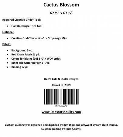 From Deb's Cats N Quilts By Heatherly, Deb In Quilts Make this fun 67.5" x 67.5" quilt in your favorite colors using the Creative Grids Half Rectangle Trim Tool CGRDH6. Choose a great contrast fabric to create the chain that runs through the quilt and ten 2 1/2" strips to make the half rectangles. Add these to background and borders and you are on your way to a great quilt! Printed Paper Pattern Finished Size: 65-1/2in x 65-1/2in Final Product: Quilt Technique Used: Standard Machine Sewing Skill Level: Confident Beginner