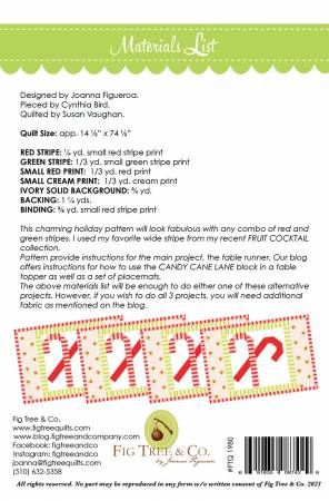 From Fig Tree Quilts By Figueroa, Joanna In Quilts This charming holiday pattern will look fabulous with any combo of red and green stripes. I used my favorite wide stripe from my recent FRUIT COCKTAIL collection. Pattern provide instructions for the main project, the tale runner. Our blog offers instruction s for how to use the CANDY CANE LANE block in a table topper as well as a set of placemats. The material list will be enough to do either one of these alternative projects. However, if you wish to do all 3 projects, you will need additional fabric as mentioned on the blog. QUILT SIZE: 14.5" x 74.5" Printed Paper Pattern Finished Size: 14-1/2in x 74-1/2in Final Product: Quilt Technique Used: Standard Machine Sewing Skill Level: Confident Beginner