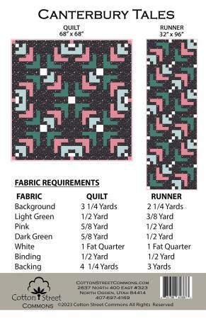 From Cotton Street Commons By Owen, Marcea In Quilts Canterbury Tales has two different patterns, one for a quilt and one for a runner. It has one simple block that creates numerous designs. It is also jelly roll friendly Printed Paper Pattern Finished Size: 68in x 68in & 32in x 96in Final Product: Quilt & Runner Technique Used: Standard Machine Sewing Skill Level: Beginner
