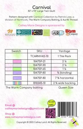 82 inch x 93 inch Large Twin Quilt Pattern designed with Carnival Collection by Patrick Lose, a division of Northcott, The Warm Company Batting, & Aurifil Thread. Cathey Marie Designs' products are created with you in mind. No More Wasted Money on patterns and tools with instructions that are too confusing to understand! Printed Paper Pattern Finished Size: 82in x 93in Final Product: Quilt Technique Used: Standard Machine Sewing Skill Level: Beginner