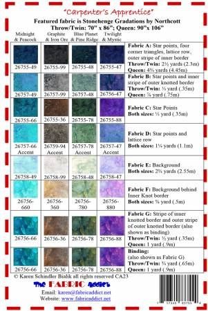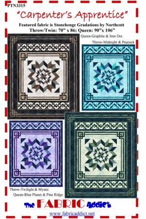 From Fabric Addict By Schindler, Karen In Quilts Carpenter's Apprentice quilt pattern. Throw/Twin, Queen sizes. Elegant quilt pattern with interesting border techniques. Printed Paper Pattern Finished Size: 70in x 76in & 90in x 86in Final Product: Quilt Technique Used: Standard Machine Sewing Skill Level: Intermediate