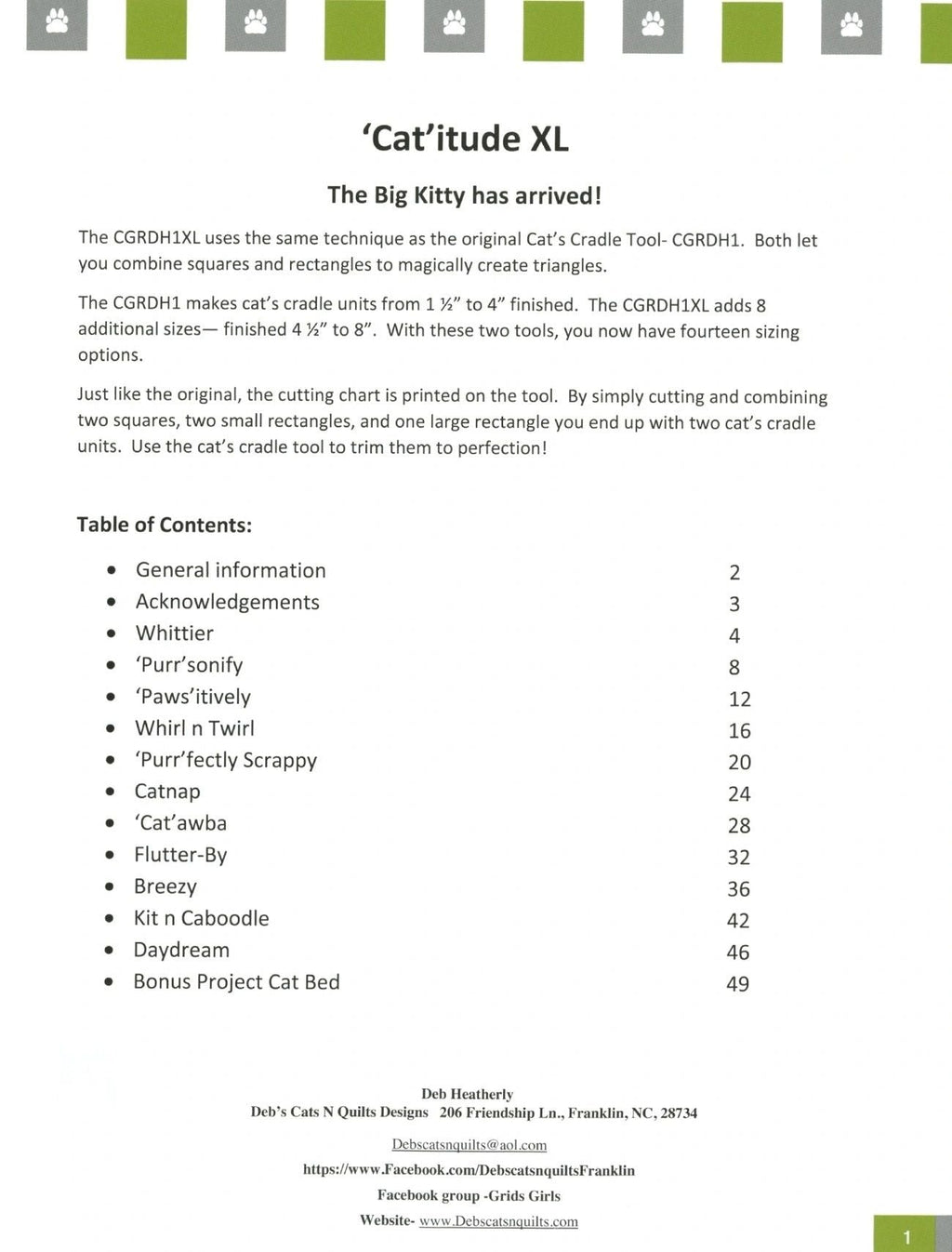 From Deb's Cats N Quilts By Heatherly, Deb In Quilting - General Catitude XL contains ten patterns that use the Creative Grids Cat's Cradle XL Tool. The CGRDH1XL uses the same technique as the original Cat’s Cradle Tool- but adds eight larger sizes--finished 4-1/2in to 8in. Both tools let you combine squares and rectangles to magically create triangles. Pages: 49 Author: Deb Heatherly Publish Date: 2018 Softcover