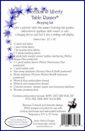 From Janine Babich Designs By Babich, Janine In Placemats, Table Runners & Toppers Set a patriotic table this summer featuring this machine embroidered applique table runner or add a hanging sleeve and turn it into a striking wall disply. Embroidery formats: ART5, DST, EXP, HUS, JEF, PCS, PES, SEW, SHV, VP3 & XXX. JPEG images for use with cutting machines and software. Requires a 5-3/4in x 10in hoop. Finished size: 20in x 48in