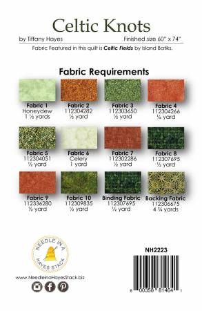 From Needle In A Hayes Stack By Hayes, Tiffany In Quilts This quilt gives a Celtic knot a brand new twist. The blocks are constructed using strip piecing. Fabric Featured in this quilt is Celtic Fields by Island Batiks. Quilt finishes at 60" x 74". Printed Paper Pattern Finished Size: 60in x 74in Final Product: Quilt Technique Used: Standard Machine Sewing Skill Level: Confident Beginner
