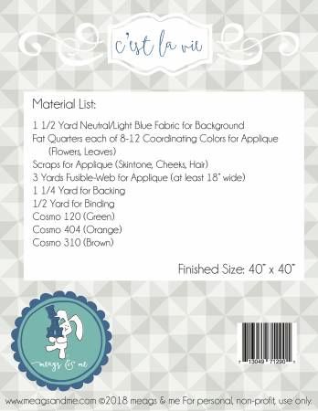 From Meags and Me By Taylor, Meagan and Jones, Kristi In Quilts Big applique pieces make this quilt fun and unique. This quilt pattern is entirely applique and embroidered flower stems/bird legs. Recommended for advanced applique artists. Pattern includes 16 large 11in x 17in pages for applique and 5 pages of instruction. Finished size is 40in x 40in