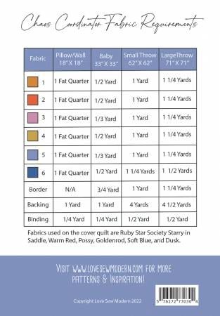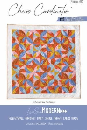 From Love Sew Modern By Grogan, Erin In Quilts The Chaos Coordinator quilt is a modern twist on the Orange Peel. The pattern comes in 4 sizes, Pillow/Wall Hanging (18”X18”), Baby (33”X33”), Small Throw (62”X62) and Large Throw (71”X71”). The Chaos Coordinator quilt is considered an intermediate/advanced pattern using curved piecing, such as the orange peel block. Included with the pattern is a coloring page, two sizes of paper templates, detailed visuals to clearly illustrate the quilt construction and skills, plus the bonus of 2+ Hrs of VIDEO TUTORIALS, including detailed tutorials for each block. Printed Paper Pattern Finished Size: 62in x 62in Final Product: Quilt Technique Used: Standard Machine Sewing Skill Level: Confident Beginner