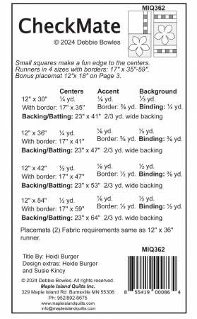 From Maple Island Quilts By Bowles, Debbie In Quilts Small squares make a fun edge to the centers. Runners in 4 sizes with borders: 17in x 35in - 59in Bonus Placemat 12in x 18in. Easy to Kit Printed Paper Pattern Finished Size: Multiple Final Product: Table Runner / Table Topper / Placemat Technique Used: Standard Machine Sewing Skill Level: Beginner