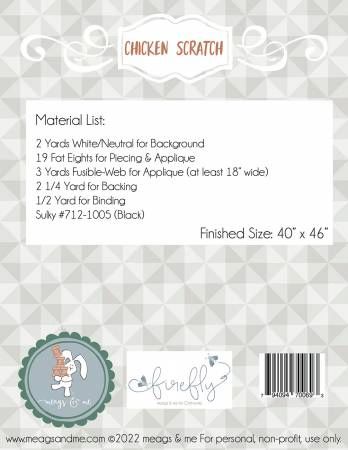 From Meags and Me In Quilts Whimsical appliquéd chickens & pinwheels- the perfect combination! Fat Eighth bundle needed. Printed Paper Pattern Finished Size: 40in x 46in Final Product: Quilt Paper Templates Included Technique Used: Applique & Standard Machine Sewing Skill Level: Confident Beginner