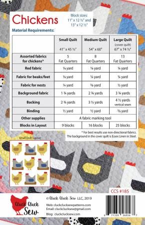 From Cluck Cluck Sew By Harris, Allison In Quilts Chickens includes instructions to make a Small quilt 41in x 45.5in, a Medium Quilt 54in x 60in, and a Large quilt 67in x 74.5in. The pattern is only made using conventional simple piecing techniques, no templates, or paper piecing. The pattern uses fat quarters for the main fabrics. Printed Paper Pattern Final Product: Quilt Finished Size: 42in x 45.5in, 54in x 60in, and 67in x 74.5in Technique: Standard Machine Sewing