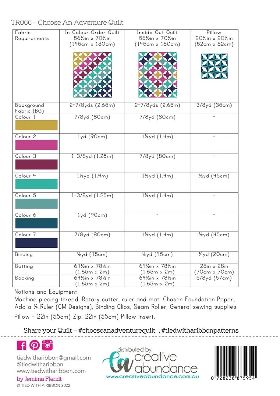 From Creative Abundance By Flendt, Jemima of Tied With A Ribbon In Quilts This Foundation Paper Pieced – Choose Your Own Adventure Quit pattern is all about choosing which design you love. There is one Pattern with two completely different design options for making this quilt. There are clear set out instructions with photos and color illustrations to help you with your machine piecing. Suitable for Beginners to Foundation Paper Piecing. Also includes a bonus Pillow Pattern. Quilt finished size – 56½in x 70½in. (145cm x 180cm) Pillow finished size – 20½in x 20½in (52cm x 52cm) The Choose Your Own Adventure Quilt pattern includes: List of fabric requirements Sewing and basic quilting instructions Foundation Paper Piecing technique instructions and tips Full color diagrams and photos Cutting instructions Pressing tips Layout and assembly instructions Binding instructions Full size Template Pages Coloring Page Bonus Pillow Pattern Paper Packs to make this Choose Your Adventure Quilt are also available (Pre-printed pages ready to sew) Printed Paper Pattern Finished Size: Multiple Final Product: Quilt Technique Used: Foundation Paper Piecing Skill Level: Confident Beginner Designed by Jemima Flendt of Tied with a Ribbon