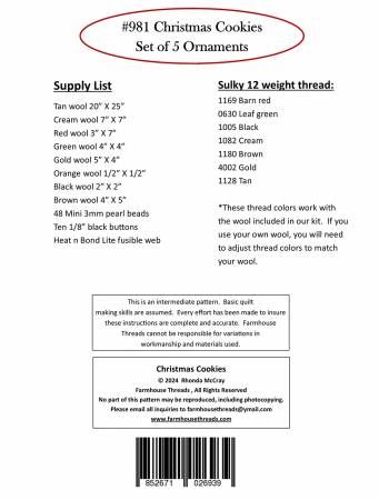 From Farmhouse Threads Inc By McCray, Rhonda In Craft Set of 5 Christmas Ornaments, wool applique and hand embroidery with button and bead embellishments Printed Paper Pattern Finished Size: 5in each Final Product: Craft Paper Templates Included Technique Used: Wool Applique / Hand Embroidery Skill Level: Beginner