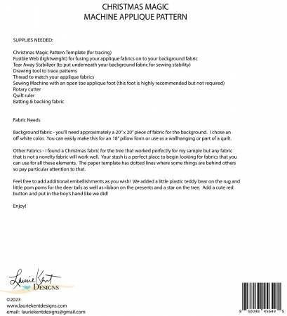 From Laurie Kent Designs In Wall Hanging Christmas Magic Applique Pattern - features lifelike machine applique template pattern by Laurie Kent Designs. Features two children getting ready for Christmas! Full-size templates to trace your elements. Make it into a wall hanging or a pillow or it can be part of a quilt. Directions & fabric requirements are included - Approximate size is 16 X 18 Skill level: Intermediate Printed Paper Pattern Finished Size: 16in x 18in Final Product: Wall Hanging Paper Templates Included Technique Used: Applique Skill Level: Confident Beginner