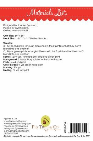 From Fig Tree Quilts By Figueroa, Joanna In Quilts Adding a wreath to my front door signifies the changing of the seasons for me and something I look forward to each year. So I thought that adding in a wreath quilt into our Christmas line up was just as lovely of an idea! These wreaths are so much fun to see come together, whether they are scrappy or all one color! Size 59" x 59"