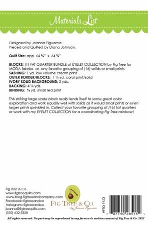 From Fig Tree Quilts In Quilts The moment I saw the first bundle of my new EYELET basics arrive on my doorstep, I saw giant flowers in a rainbow of colors. Creating a medley block from a few of my all-time favorites was a fun creative process for me and I really love the result! I feel like the large scale of the blocks and the array of solid feeling colors makes for a really enticing combination. Each block is like its own little masterpiece and the blocks are the perfect size if you ask me…. not too small and not too large! Printed Paper Pattern Finished Size: 64-3/4in x 64-3/4in Final Product: Quilt Technique Used: Standard Machine Sewing Skill Level: Confident Beginner