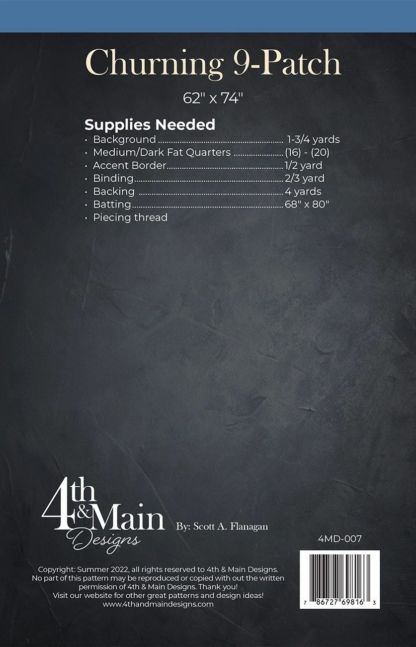 Combine two of the most popular blocks in quilting, the Churn Dash and 9-Patch block, into one to make this cozy Fat Quarter friendly project. Printed Paper Pattern Finished Size: 62in x 74in Final Product: Quilt Technique Used: Standard Machine Sewing Skill Level: Confident Beginner