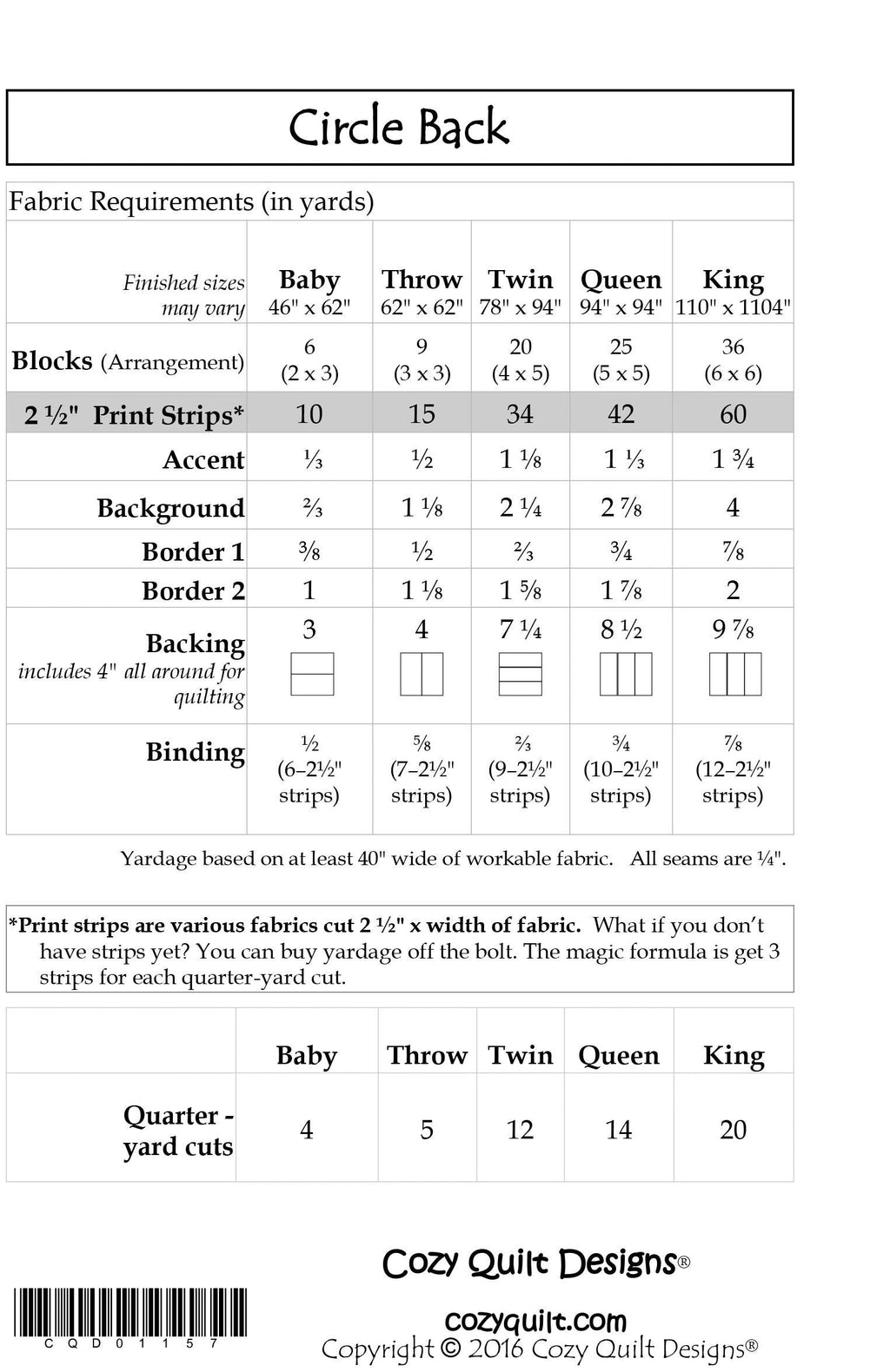 From Cozy Quilt Designs In Quilts A Cozy Strip Club Pattern Designed for 2-1/2in Strips. Circle Back features a unique design using only one strip bundle and background fabrics. It's just one block, so the whole thing comes together quickly and easily! The pattern includes instructions for: • Baby • Throw • Twin • Queen • King