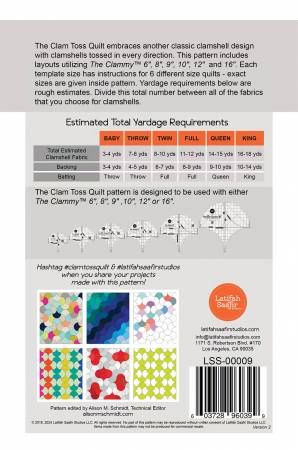 From Latifah Saafir Studios LLC In Quilts The Clam Toss Quilt embraces another classic clamshell design with clamshells tossed in every direction. This pattern includes layouts utilizing The Clammy 6", 8", 9", 10", 12", and 16". Each template size has instructions for 6 different size quilts - exact sizes are given inside pattern. Pattern includes layouts for baby to king size quilts. Printed pattern includes full PDF download of pattern and bonus coloring pages.
