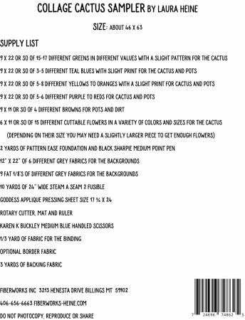 From Fiberworks Inc By Heine, Laura In Quilts Collage Cactus Sampler Pattern by Laura Heine includes complete instruction and full sized patterns to complete the 9 block Sampler quilt. Size 46 x 63
