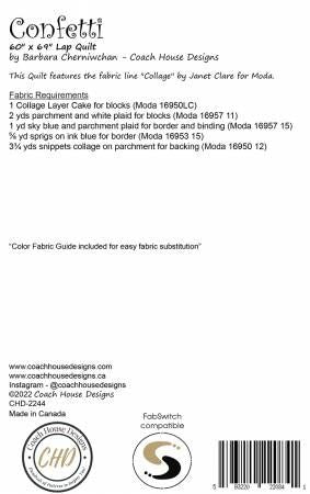 From Coach House Designs By Cherniwchan, Barbara In Quilts 60" x 69" simple lap quilt using a layer cake from Janet Clare's Collage fabric line. Printed Paper Pattern Finished Size: 60in x 79in Final Product: Quilt Technique Used: Standard Machine Sewing Skill Level: Confident Beginner