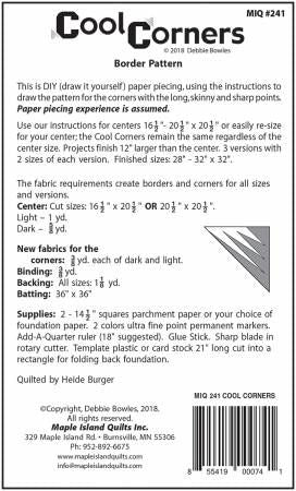 From Maple Island Quilts By Bowles, Debbie In Quilts A border pattern for centers 16-1/2in - 20-1/2in x 20-1/2in. 3 versions and 2 sizes of each version. Finished sizes 28-32in x 32in. Paper pieced corners that the customer draws with our instructions. Paper piecing experience is assumed. Easy to re-size. Bonus place mat pattern.