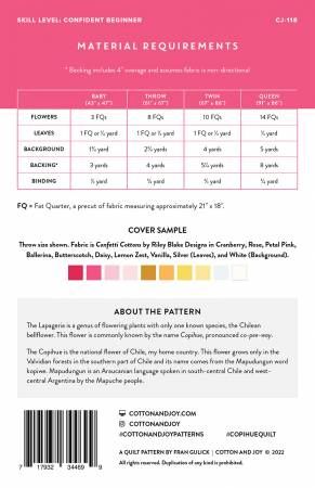 From Cotton and Joy By Gulick, Fran In Quilts The Copihue (pronounced co-pee-way) is the national flower of Chile, my home country. This pattern was inspired by its distinct bell shape and uses block rotation and reflection for a modern look full of fun whimsy. Copihue is the perfect pattern for confident or advanced beginner sewists ready to try curves. Pattern include multiple sizes from baby to queen size. Printed Paper Pattern Finished Size: 61in x 67in Final Product: Quilt Paper Templates Included Technique Used: Standard Machine Sewing Skill Level: Confident Beginner