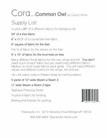 From Fiberworks Inc By Heine, Laura In Quilts Cora the common owl collage pattern by Laura Heine features full sized patterns and complete instructions to complete the 21 x 45 collage quilt.