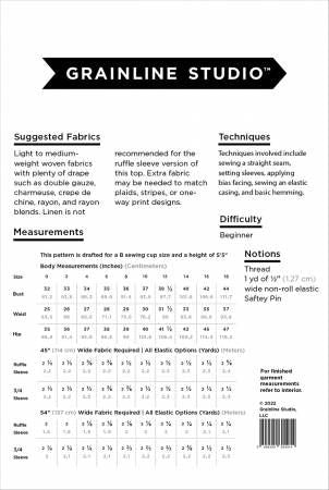 From Grainline Studio LLC By Beeman, Jennifer In Wearables The Corin is a drapey drop shoulder top with a wide round neckline. The pattern includes two sleeve options – a ruffled cap sleeve and a straight 3/4 length sleeve. An optional gathered elastic detail at the front and back waist adds interest and shaping. While we have have sewn up three views of the pattern, the sleeves and elastic can be combined in any configuration to create 6 different options. Techniques involved include sewing a straight seam, setting sleeves, applying bias facing, sewing an elastic casing, and basic hemming. Printed Paper Pattern Finished Size: 0-18 Final Product: Wearables / Clothing Paper Templates Included Technique Used: Standard Machine Sewing Skill Level: Beginner