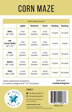 From My Beste Quilt Co By Den Beste, Renee In Quilts Corn Maze is a pre-cut friendly, scrappy pattern using fat quarters. This pattern is perfect for confident beginners. The pattern has instructions for baby (48" x 48"), Lap (60" x 72"), Twin (72" x 96"), Queen (96" x 108") and King (108" x 108"). Scrap Friendly Fat Quarter Friendly Printed Paper Pattern Finished Size: Multiple Finished Product: Quilt Technique Used: Standard Machine Sewing Skill Level: Confident Beginner