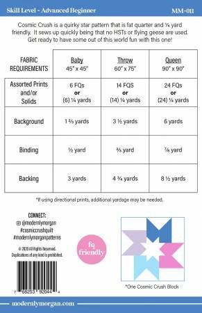 From Modernly Morgan By McCollough, Morgan In Quilts The Cosmic Crush quilt is a wonderfully fun and scrappy star quilt pattern! It’s fat quarter friendly (1/4 yard friendly too!) and lends itself perfectly to any curated FQ bundle or fabric collection you may have your eye on! And the best part…drumroll please…there are no HSTs or flying geese needed for this pattern! Pattern comes in Baby, Throw and Queen sizes and is perfect for advanced beginners and up. Printed Paper Paper Final Product: Quilt Size: 45in x 45in, 60in x 75in, and 90in x 90in