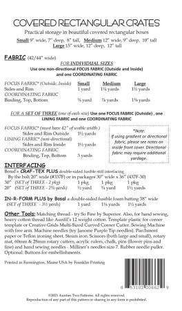 Covered Rectangular baskets in three sizes Small 9” wide x 8” tall x 7” deep Medium 12” wide x 10” tall x 9” deep Large 15” wide x 12” tall x 12” deep