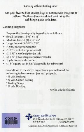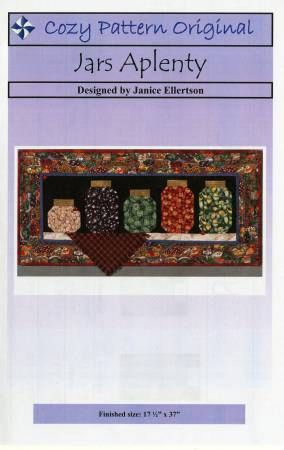 From Cozy Quilt Designs By Ellertson, Janice In Quilts Jars Aplenty - A Cozy Original Pattern! One of our most popular patterns, this wall-hanging allows you to "can" all of those great vegetable and fruit fabrics and display them on a fabric shelf. The jars vary in size and sit on a three dimensional napkin made of homespun fabric. It's fast, easy, fun, and is the perfect decoration for your kitchen! Jars Aplenty finishes at 17" x 35".