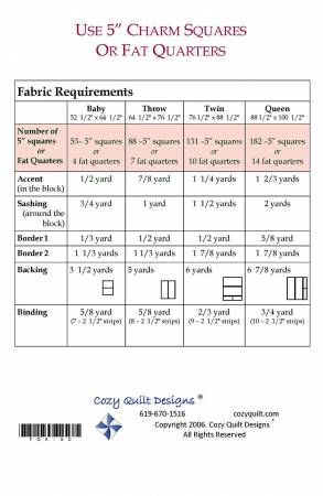 From Cozy Quilt Designs By Stout, Daniela In Quilts Simply Charming - A Charm School Pattern! Use 5 inch charm squares or fat quarters to make this Simply Charming quilt! The pattern includes instructions for: • Baby • Throw • Twin • Queen