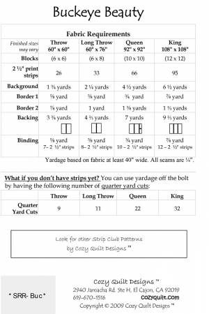 From Cozy Quilt Designs By Stout, Daniela In Quilts Buckeye Beauty - A Strip Club Pattern Designed for 2½" Strips. A classic beauty with a strip twist. You can create this time-tested design out of 2½" strips. With the tube technique, you even add a charming touch with pieced diamonds that makes the quilt a dazzler! You can make your work even easier by using the The Strip Tube RulerTM #CQD05001. The pattern includes instructions for: Throw 60in x 60in Long Throw 60in x 76in Queen 92in x 92in King 108in x 108in
