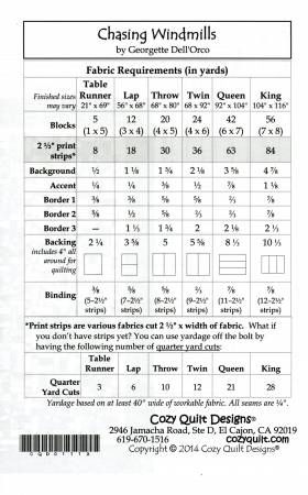 From Cozy Quilt Designs By Dell'Orco, Georgette In Quilts Chasing Windmills - A Cozy Strip Club Pattern Designed for 2½" Strips In typical Cozy design style, we have another wonderful pattern for 2½" strips that is one simple repeating block. The magic is in the visual effect of the broken square, the windmills, and how four blocks come together to create a secondary design of pinwheels. Pick your favorite strip bundle, a nice contrasting background, and some accent fabric to make the pinwheels pop, and you are on your way to catching your own winner of a strip club quilt. In this pattern, we use a simple stitch and flip technique to make the diagonal points. Easy and fun. To make it even faster, we recommend the cool gadget by Prairie Sky Quilting called Folded Corner Clipper! The pattern includes instructions for: • Table Runner • Lap • Throw • Twin • Queen • King