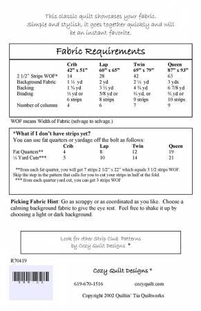 From Cozy Quilt Designs By Stout, Daniela In Quilts Chinese Coin - A Strip Club Pattern Designed for 2½" Strips. This classic quilt shows off a coordinated line of fabric quickly and beautifully. It's simple and effective. The pattern includes instructions for: Crib Lap Twin Queen