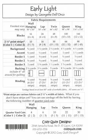 From Cozy Quilt Designs By Dell'Orco, Georgette In Quilts Early Light - A Cozy Strip Club Pattern Designed for 2½" Strips Whether you choose to go patriotic or keep it scrappy, Early Light will definitely show off your style and your favorite fabric bundle. As we love so much, this quilt is just one simple block twisted and turned to create a fabulous quilt to fill your heart with pride. The pattern includes instructions for: • Wall Hanging • Lap • Twin • Queen • King