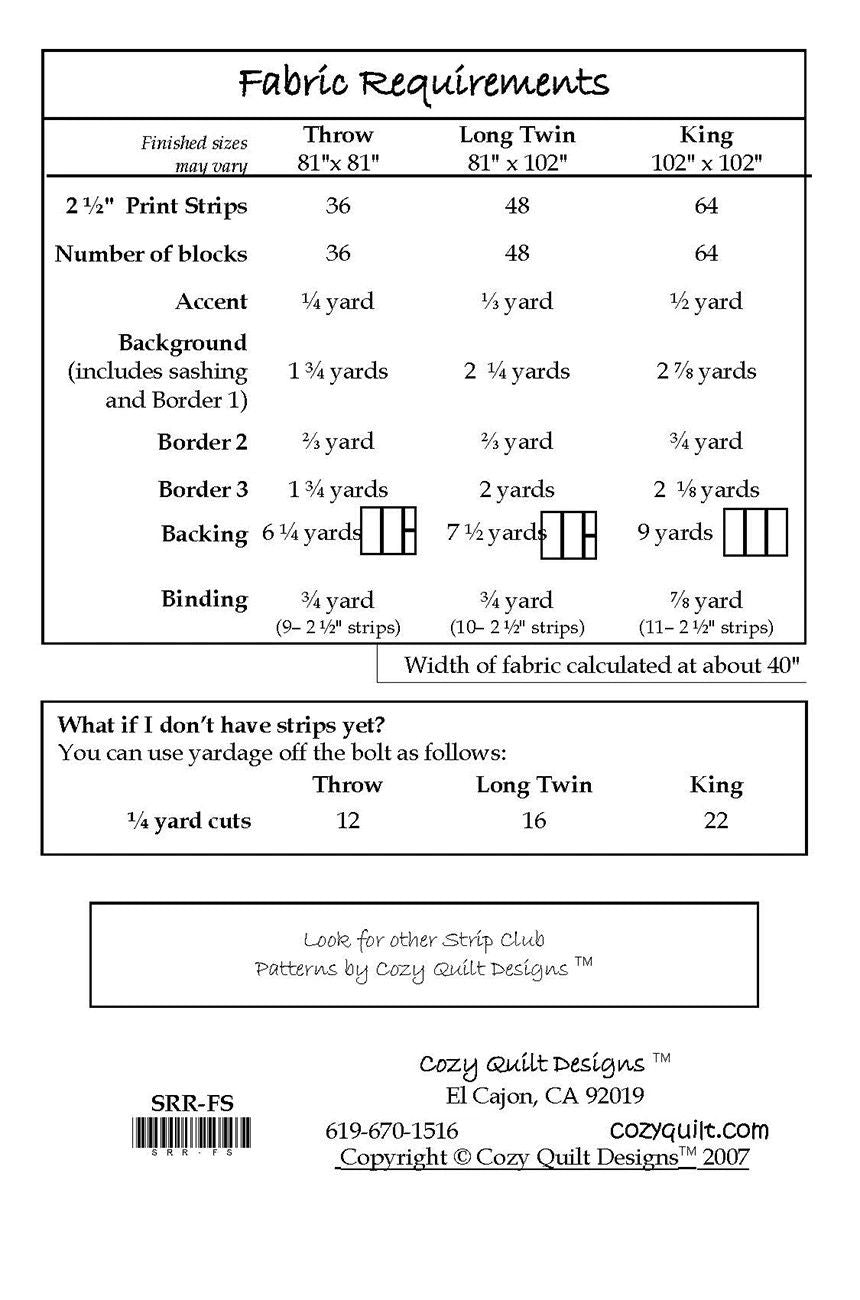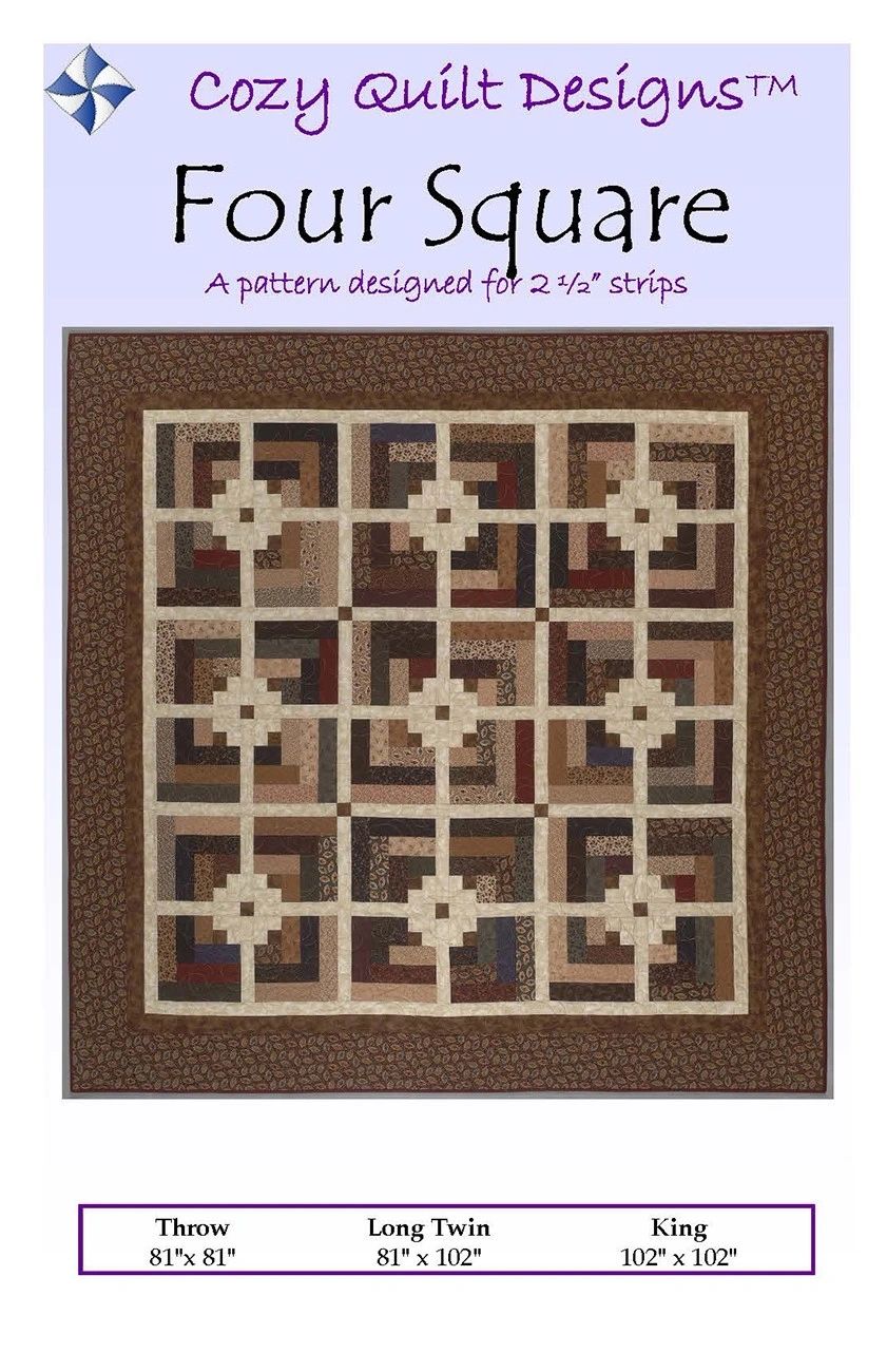 From Cozy Quilt Designs By Stout, Daniela In Quilts Four Square - A Strip Club Pattern Designed for 2½” Strips! Almost a log cabin, but not quite, this terrific quilt is charming and easy. The pattern includes instructions for: Throw - 81in x 81in Long Twin - 81in x 102in King - 102in x 102in