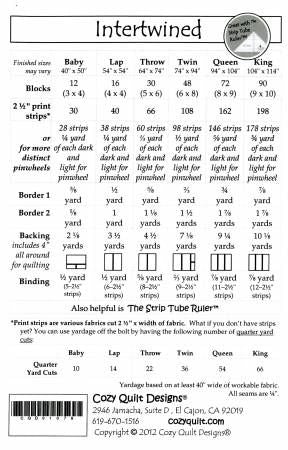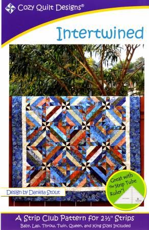 From Cozy Quilt Designs By Stout, Daniela In Quilts Intertwined - A Cozy Strip Club Pattern Designed for 2½" Strips It's amazing what you can do with just strip fabrics and borders! With just handful of 2 ½" strips and the tube technique, you can complete this striking quilt in no time at all. It is one simple block twisted and turned to create the intertwined effect with popping pinwheels. So grab your favorite strip bundle and get going! As a bonus feature, we have included the fabric requirements you need if you want additional yardage for the pinwheels. This is particularly helpful if you want to use pinwheel fabrics that contrast your strip bundle and really pop! This great pattern is made even easier with Cozy's Strip Tube Ruler! The pattern includes instructions for: • Baby • Lap • Throw • Queen • King