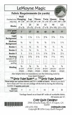 From Cozy Quilt Designs By Stout, Daniela In Quilts LeMoyne Magic - A Cozy Strip Club Pattern Designed for 2-1/2in Strips The LeMoyne Block is no longer daunting, scary, or difficult! Thanks to the beauty of pre-cut 2-1/2in strips and the tube technique, you can make your own LeMoyne Magic quilt with ease and confidence. There are no Y-seams, no difficult sewing, and no reason to run away from this block any longer. Just partner two strip fabrics for a star, sew some tubes and cut half-square triangle blocks using either a square up ruler or our favorite Cozy tool, The Strip Tube Ruler™. And truth be told, The Strip Tube Junior™ makes the project even easier because it is perfect for this size block! While the LeMoyne block is pretty by itself, this magical design makes it all the more beautiful with the addition of an interesting, complementing block that is used to alternate with the LeMoyne Star. So choose a bundle of beautiful strips, grab out your The Strip Tube Junior (or Strip Tube Ruler), and get going. You've got a stunning LeMoyne Star quilt to make!!"