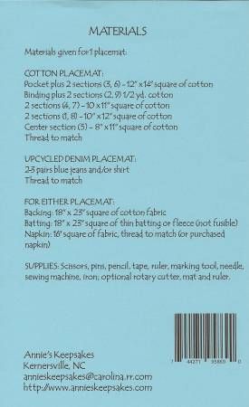 From Annie's Keepsakes By Clontz, Vickie In Placemats, Table Runners & Toppers This fun 15" x 20" placemat is perfect to use all year round and can be made up in lots of different fabrics! Shown are a mat made up in recycled blue jeans and a denim shirt, we used the jeans side seams for a fun twist on the binding and the shirt pocket to hold the tie-dyed napkin! Also shown is a placemat made up in Moda's "Flower Press" line in blues, but this would also make up beautifully in Christmas fabrics, spring fabrics, even silks and velvets for a true crazy patch look. This is also a great pattern to show off those fancy stitches on your sewing machine, or even some hand-stitched embroidery! Full-sized pattern pieces and placemat layout included. Lots of creative possibilities in this style for confident beginners. Printed Paper Pattern Finished Size: 15in x 20in Final Product: Placemats / Table Runner / Table Topper Paper Templates Included Technique Used: Standard Machine Sewing Skill Level: Confident Beginner