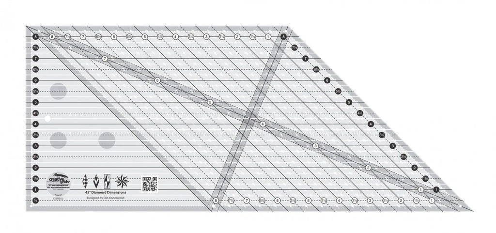 From Creative Grids USA By Underwood, Erin BF2024 Collection In Rulers & Accessories This item has a MAP (Minimum Advertised Pricing) Policy. Please do not advertise it for less than $38.99. This 45 degree diamond dimensions ruler will increase your diamond design possibilities. Easy to read black and white markings. Cuts chevrons, half-diamonds, quarter-diamonds, and traditional diamonds from strips. Use the 45 degree end to cut mitered border corners. Comes with fully illustrated step by step instructions. Scan the QR Code printed on the ruler to view a how-to video of these features and to see the patterns that can be made with this ruler. Ruler slides easily over the fabric until pressure is applied. Then our exclusive grip holds the fabric in place while cutting, eliminating slipping and miss-cuts. Total Size – 8-1/2in x 20-1/2in Creative Grids® Rulers are made in the USA and sold through independent quilt shops as well as select online retailers. Creative Grids® products have a MAP/IMAP (Minimum Advertised Price/Internet Minimum Advertised Price) Policy. Please do not advertise them for less than the suggested retail price.