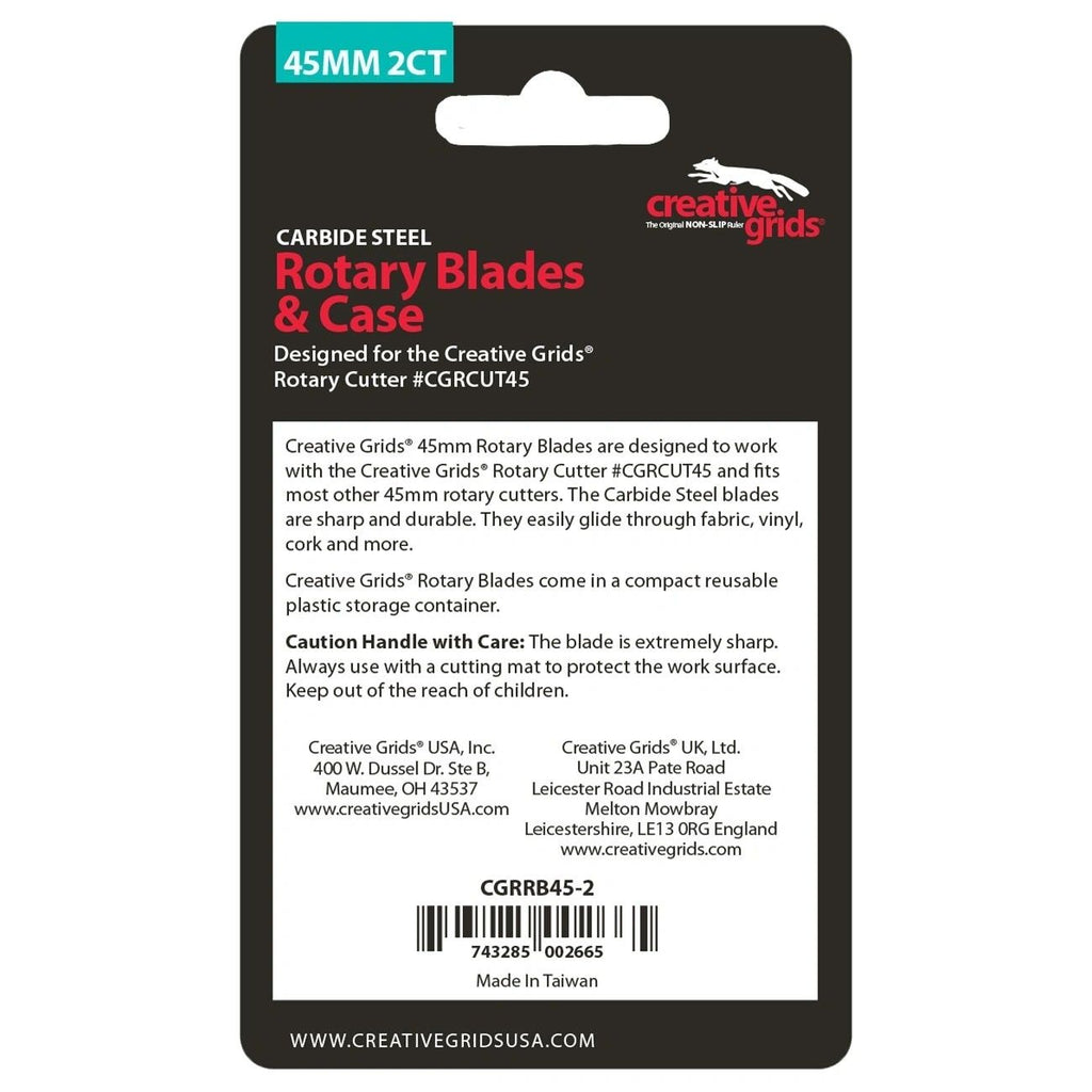 From Creative Grids USA BF2024 Collection In Cutters & Accessories This item has a MAP (Minimum Advertised Pricing) Policy. Please do not advertise it for less than $7.99. Creative Grids® 45mm Rotary Blades are designed to work with the Creative Grids® Rotary Cutter (CGRCUT45) and fits most other 45mm rotary cutters. The carbide steel blades are sharp and durable. They easily glide through fabric, vinyl, cork, and more. Creative Grids® Rotary Blades come in a compact, reusable plastic storage container. • Made of: Carbide Steel • Size: 45mm • Included: Two 45mm Rotary Blades • Use: Rotary Cutting Creative Grids® products are sold through independent quilt shops as well as select online retailers. Creative Grids® products have a MAP/IMAP (Minimum Advertised Price/Internet Minimum Advertised Price) Policy. Please do not advertise them for less than the suggested retail price.