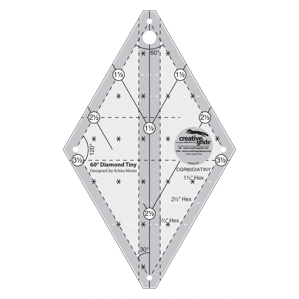 From Creative Grids USA By Moser, Krista BF2024 Collection In Rulers & Accessories This item has a MAP (Minimum Advertised Pricing) Policy. Please do not advertise it for less than $18.49. Use this 60 Degree Tiny Diamond Ruler to cut diamonds, triangles, hexagons, trapezoids, parallelograms, and 120 degree side-setting triangles up to 3-1/2in. • Easy to read black and white markings • Maximize your fabric usage by cutting shapes from strips • Strip sets make interesting design possibilities when cut with this ruler • Comes with fully illustrated step by step instructions • Scan the QR Code printed on the instructions to view a how-to video of these features and to see the patterns that can be made with this ruler • Ruler slides easily over the fabric until pressure is applied. Then our exclusive grip holds the fabric in place while cutting, eliminating slipping and miss-cuts Total size: 6-1/2in x 4in Creative Grids® Rulers are made in the USA and sold through independent quilt shops as well as select online retailers. Creative Grids® products have a MAP/IMAP (Minimum Advertised Price/Internet Minimum Advertised Price) Policy. Please do not advertise them for less than the suggested retail price.