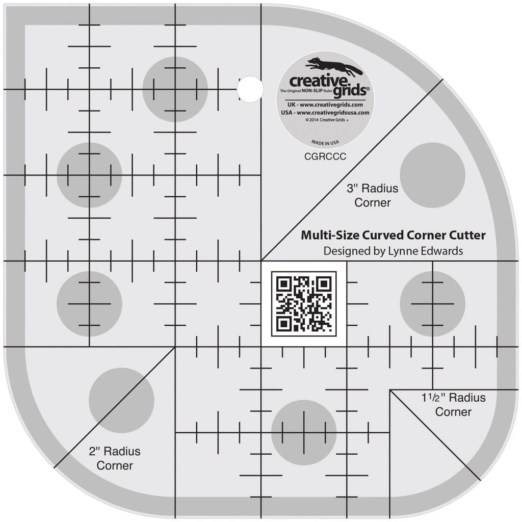 From Creative Grids USA By Edwards, Lynne BF2024 Collection In Rulers & Accessories This item has a MAP (Minimum Advertised Pricing) Policy. Please do not advertise it for less than $26.99. Use the Curved Corner Cutter to create round corners on a variety of projects. • Easy to read markings. • Choose from curves with a radius of 1-1/2in, 2in, or 3in. Each one features 45 and 90 degree markings. • Also good for marking scalloped borders. • Use bias binding for the best finishing results. • Comes with fully illustrated step by step instructions. • Scan the QR Code printed on the ruler to view a how-to video of these features and to see the projects that can be made with this ruler. • The ruler slides easily over the fabric until pressure is applied. Then our exclusive grip holds the fabric in place while cutting, eliminating slipping and miss-cuts. Total Size – 6in x 6in Creative Grids® Rulers are made in the USA and sold through independent quilt shops as well as select online retailers. Creative Grids® products have a MAP/IMAP (Minimum Advertised Price/Internet Minimum Advertised Price) Policy. Please do not advertise them for less than the suggested retail price.
