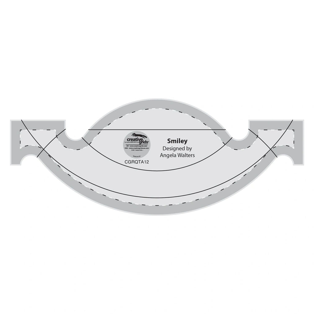 From Creative Grids USA By Walters, Angela BF2024 Collection In Rulers & Accessories This item has a MAP (Minimum Advertised Pricing) Policy. Please do not advertise it for less than $26.99. Designed by machine quilting teacher and author, Angela Walters, Smiley is sure to put a grin on your face. Quilting arc shapes doesn’t have to be tricky or difficult. Smiley includes two differently sized arcs for even more versatility. • Made in the USA with high quality acrylic and precision measurements ensuring accuracy for your quilting, sewing, patchwork, and crafting projects. • Creative Grids® exclusive non-slip grip allows you to easily slide the quilting tool over the fabric until pressure is applied. Then, the grip holds the quilting tool in place, eliminating slipping while you quilt. • Black and White dashed guide lines are visible on all fabric colors • Easy to use. Simply install a ruler foot on your machine and quilt along your chosen edge of the template for endless design possibilities. • Use Smiley to quilt arcs, curved echoes, curved motifs with gentle arcs in two sizes, continuous curves, cables, and more. • Needle stops ensure perfect starting and stopping points when stitching out designs. To learn more, view a video demonstration. • Thickness is approximately 1/4in which is perfect for high shank home sewing machines and most longarms. Total Size – 3in X 7-1/2in Creative Grids® rulers are made in the USA and sold through independent quilt shops as well as select online retailers. Creative Grids® Rulers have Minimum Advertised Price (MAP) & Internet Minimum Advertised Price (IMAP) Policies. Please do not advertise them for less than their suggested retail price.