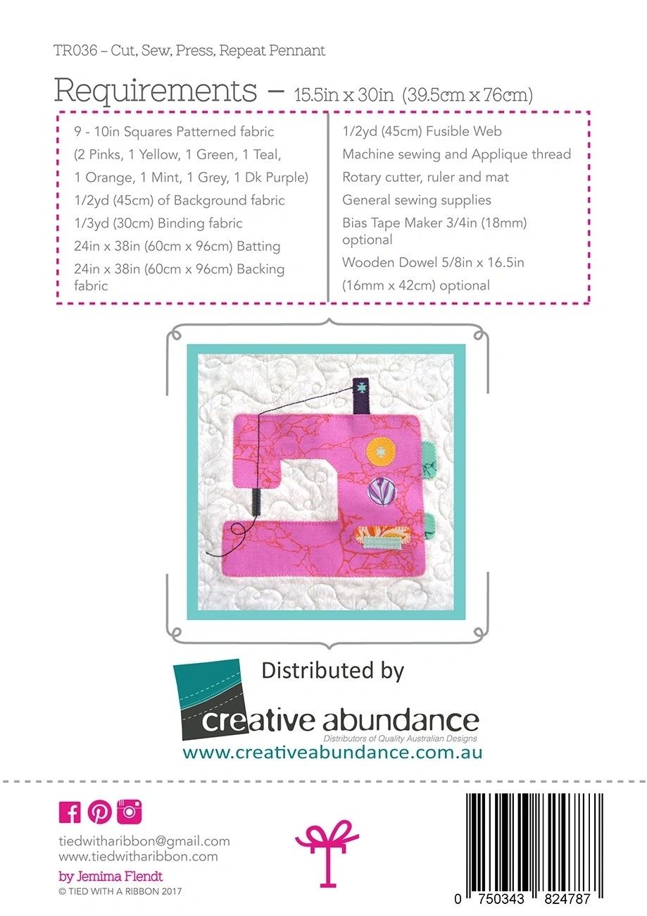 From Creative Abundance By Flendt, Jemima of Tied With A Ribbon In Wall Hanging Cut, Sew, Press Repeat is the latest play on words, fun pennant/mini quilt. Featuring a favorite quote and sewing equipment this pennant/mini quilt will jazz up any sewing space, look fab among a group of mini quilts, or great for a mini quilt swap. It is suitable for beginner/intermediate sewers - you will need basic knowledge of rotary cutting and sewing principles. The pattern includes clear instructions with photos and illustrations and uses 10in squares but would also be a fantastic project to use up some of your scraps. Pennant finishes at 15-1/2in x 30in (39.5cm x 76cm). Included: List of fabric requirements Cutting instructions Pattern templates for lettering and sewing equipment Layout and assembly instructions Binding/tab/hanging tie instructions Designed by Jemima Flendt of Tied with a Ribbon.