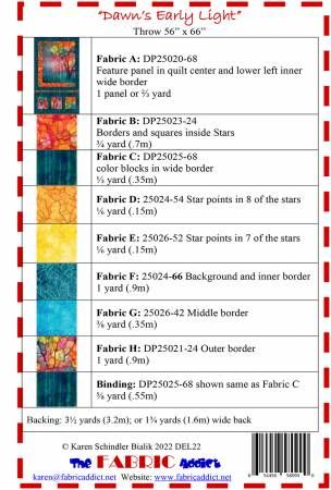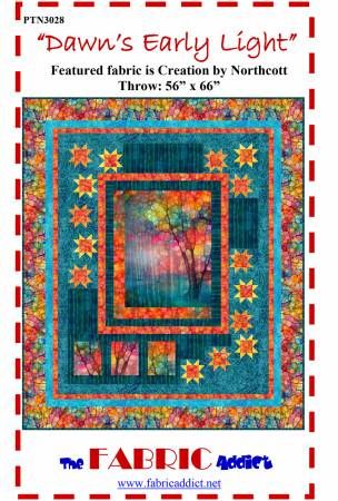 From Fabric Addict By Schindler, Karen In Quilts Dawn's Early Light quilt pattern. Easy to piece using a panel. Suggested ruler is a Flying Geese ruler. Printed Paper Pattern Finished Size: 56in x 66in Final Product: Quilt Technique Used: Standard Machine Sewing Skill Level: Confident Beginner